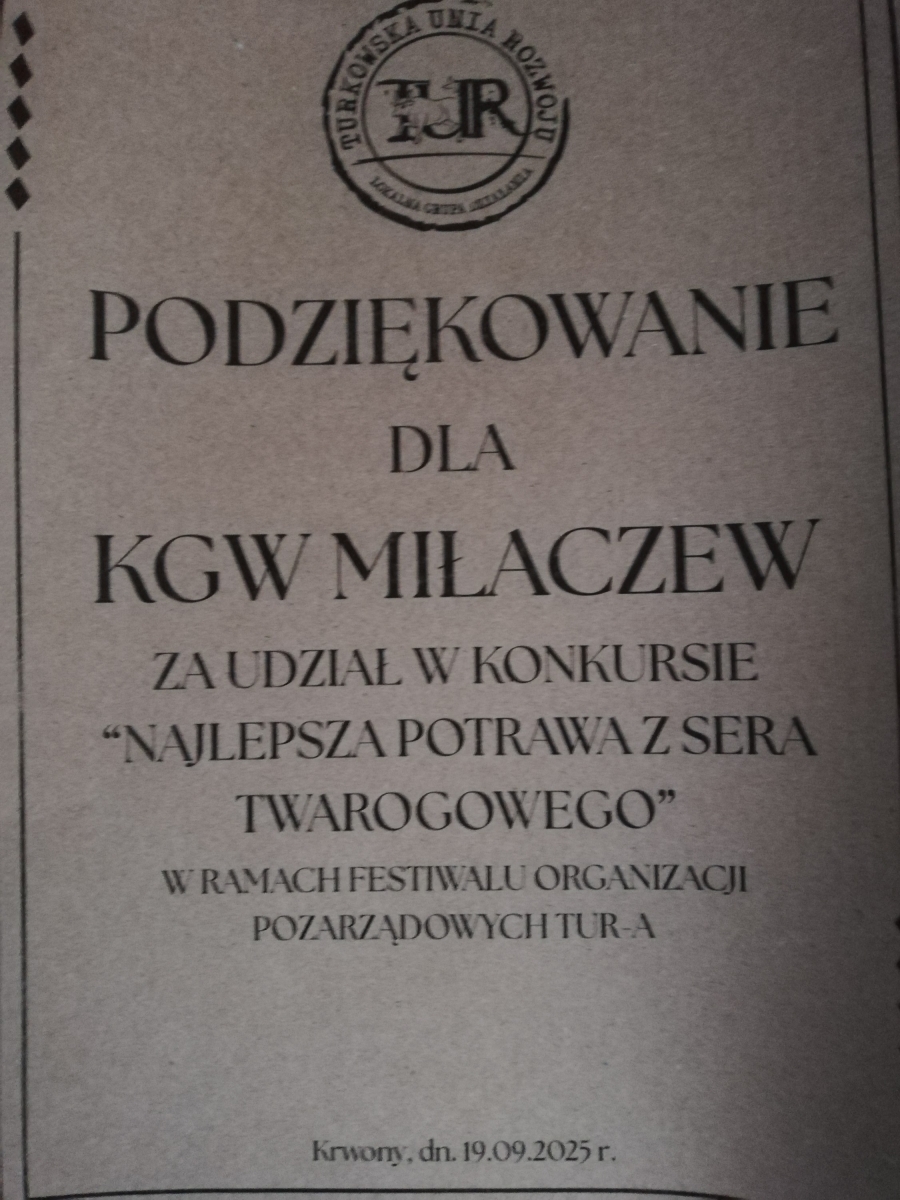 W dniu 19 września br. w Krwonach odbył się Festiwal Organizacji Pozarządowych TUR-a 2025, a nieodłącznym elementem, tego festiwalu jest konkurs kulinarny dla Kół Gospodyń Wiejskich, który tym razem przebiegał pod hasłem „Najlepsza potrawa z sera twarogowego”. Uczestnicy konkursu rywalizowali w dwóch konkurencjach: danie na słodko i danie wytrawne. Koła wykazały się nie lada kunsztem, przygotowując dania z sera twarogowego w atrakcyjnej formie, ale z przepisów zaczerpniętych z tradycji z wykorzystaniem lokalnych produktów. Niezmiernie miło nam poinformować, że Koło Gospodyń Wiejskich w Miłaczewie zdobyło I miejsce w kategorii danie na słodko za „naleśniki z serem”. W nagrodę otrzymaliśmy pamiątkowy dyplom oraz nagrodę finansową.