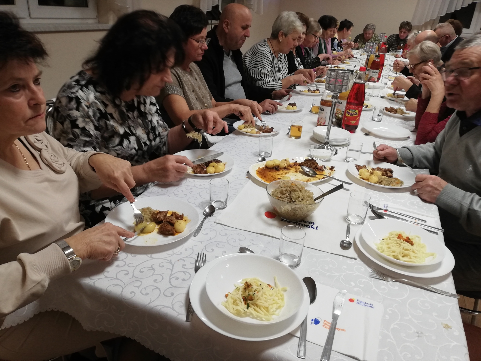 Na stołach zagościł aromatyczny rosół, a następnie podano karkówkę w sosie z kluskami śląskimi i kapustą zasmażaną. Gorące ii zimne napoje. Nie zabrakło także słodkości Panie z KGW przygotowały sernik, jabłecznik, ciasto cytrynowe, babkę, malinową chmurkę, pączki i rurki z kremem, które cieszyły się ogromnym powodzeniem wśród uczestników.