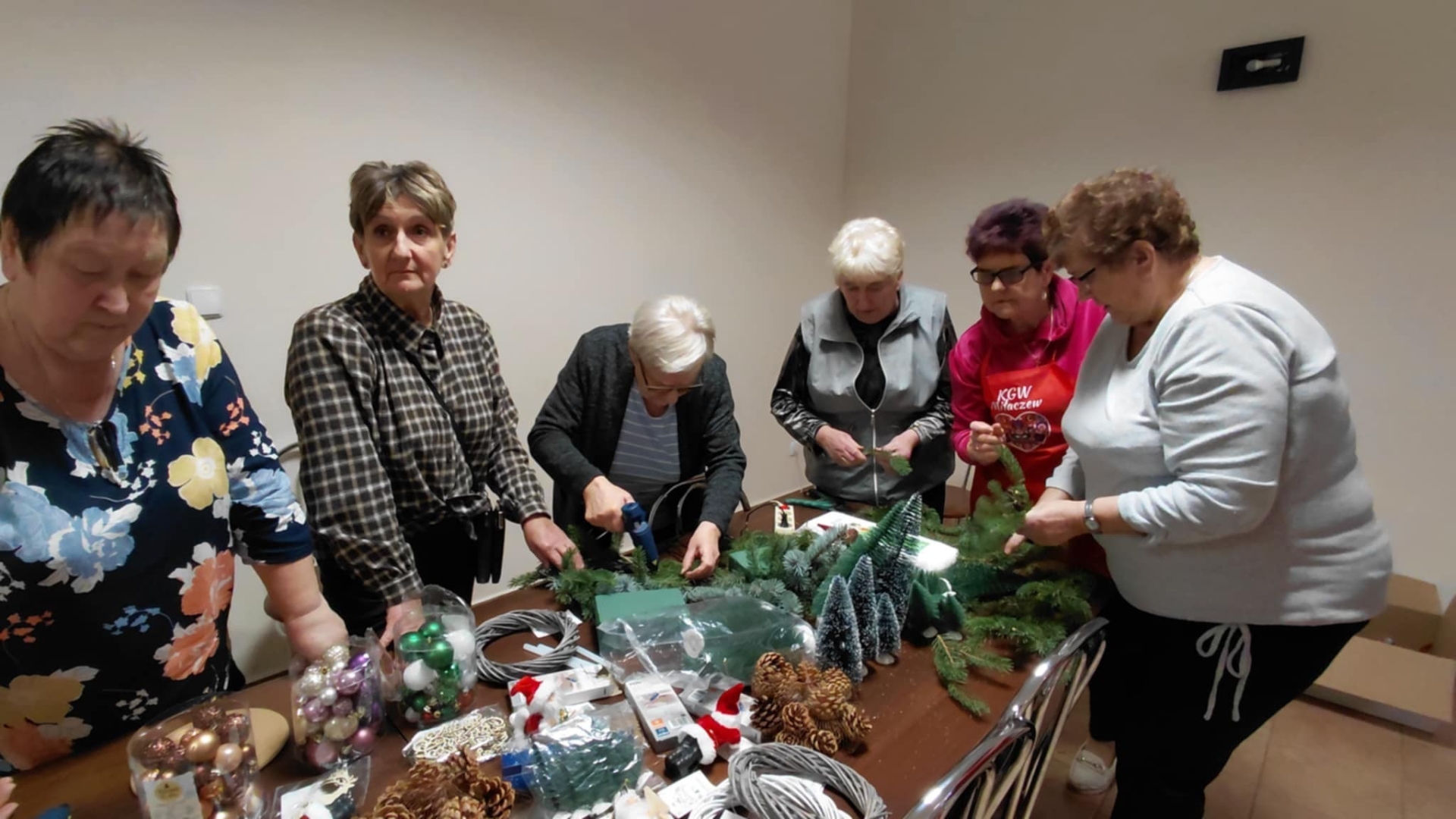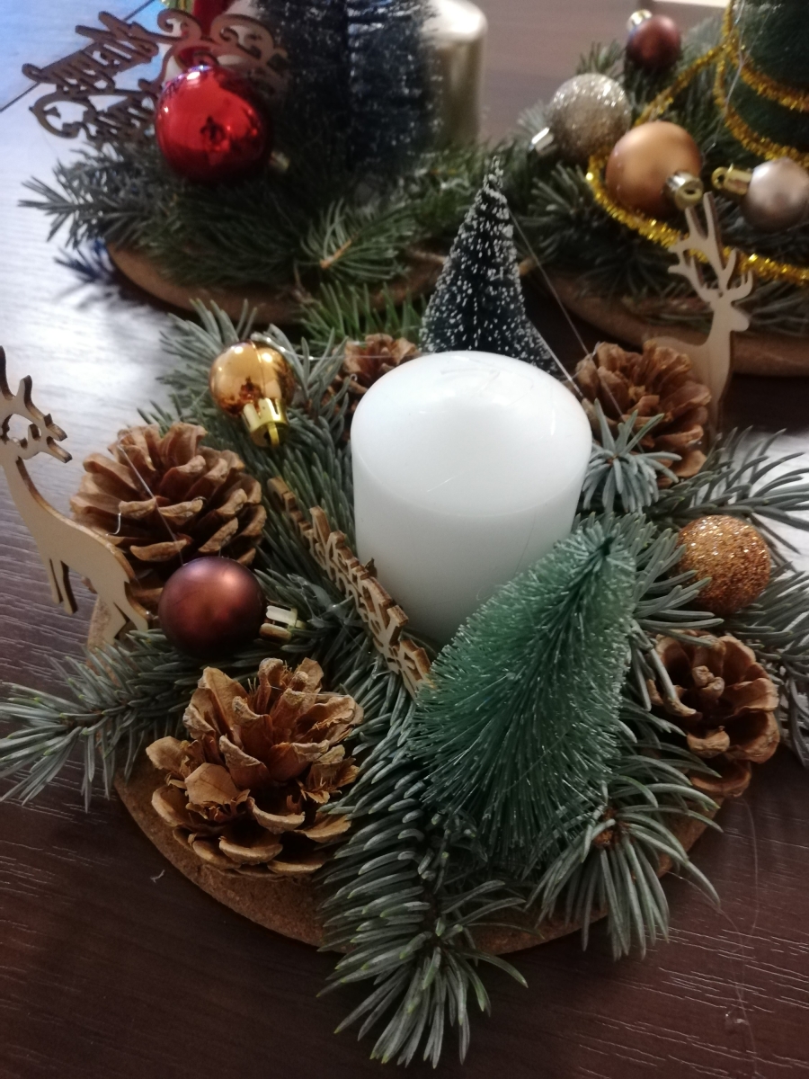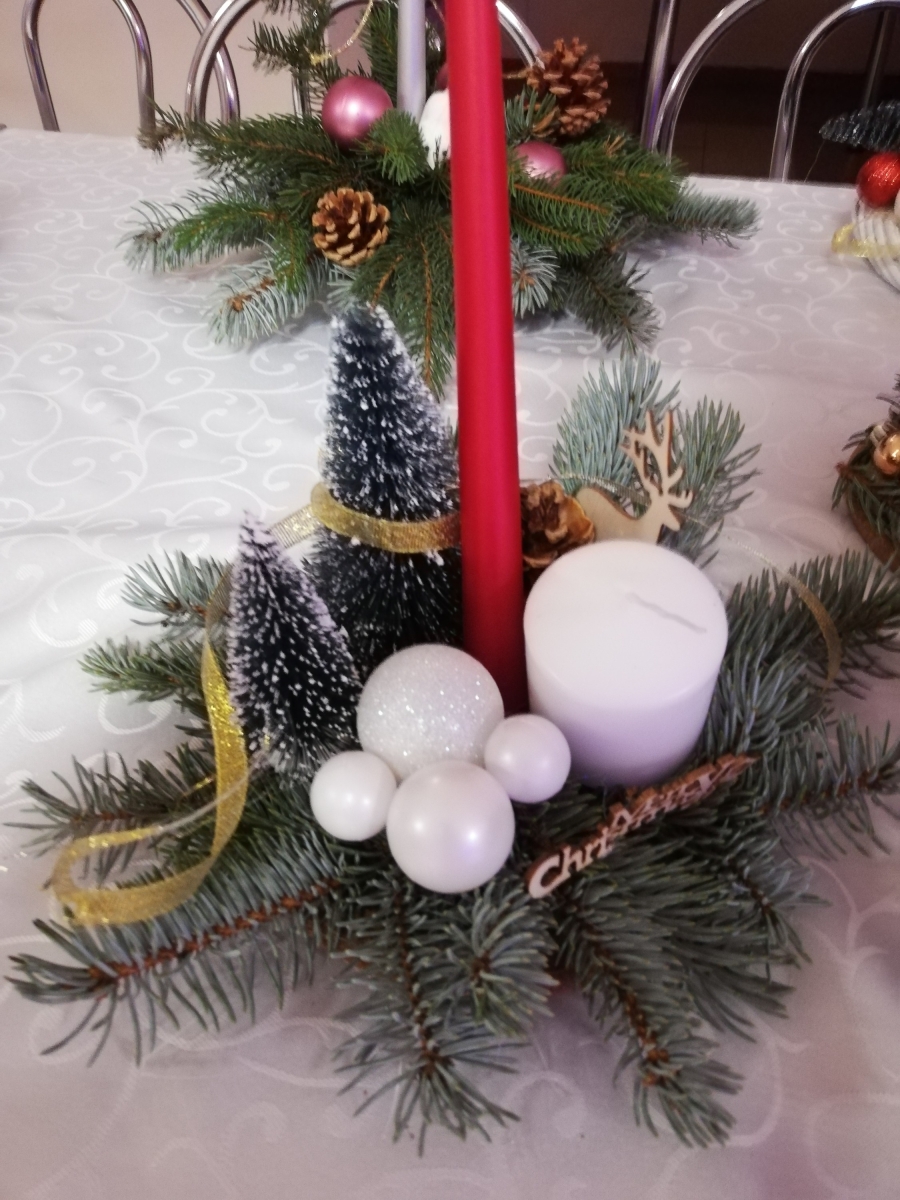 Podczas tego spotkania zorganizowaliśmy również warsztaty, podczas których uczestnicy mieli okazję wykonać zielone, świąteczne stroiki, które udekorują ich domy w nadchodzącym okresie świątecznym. Wykorzystano do tego gałązki świerku, szyszki, świeczki, figurki oraz kolorowe bombki. Każdy stroik był różnej wielkości i stylistyki, dzięki czemu powstały niepowtarzalne i kreatywne kompozycje.