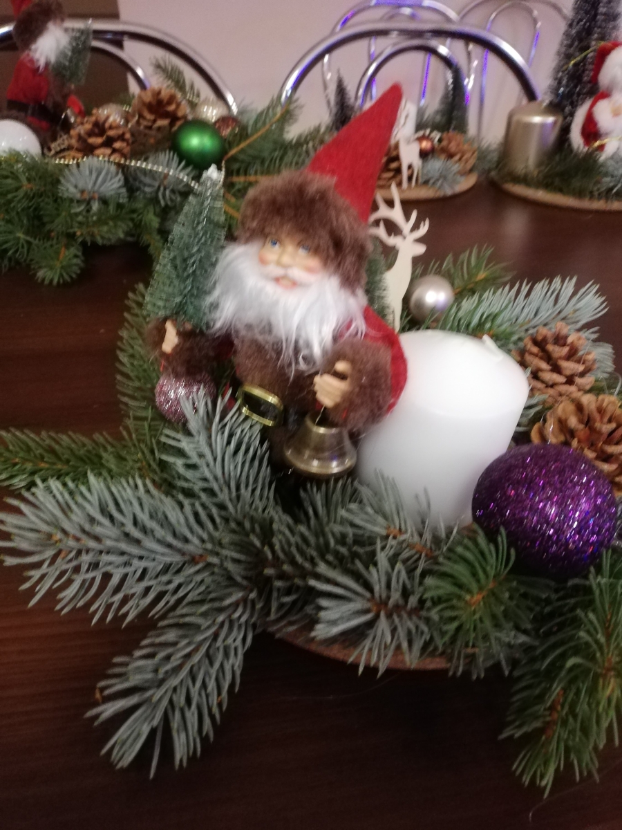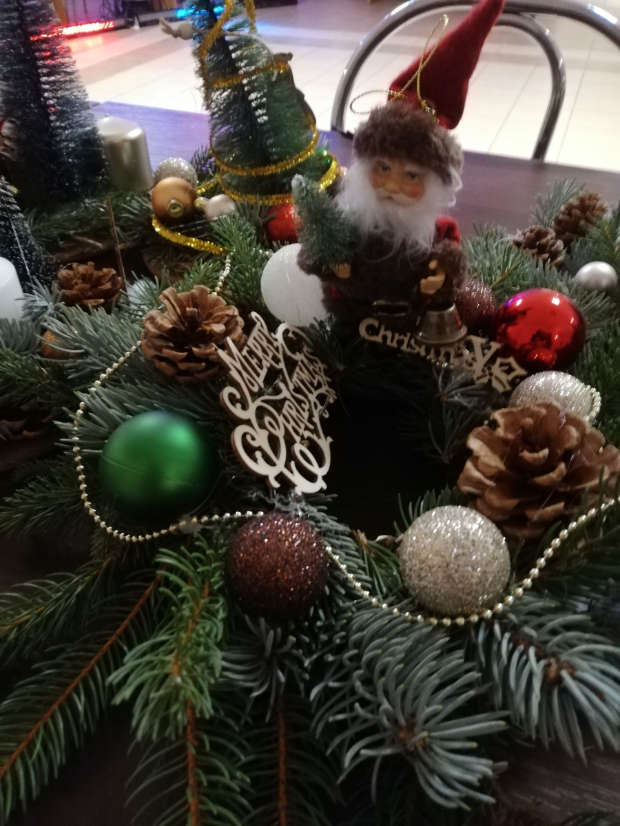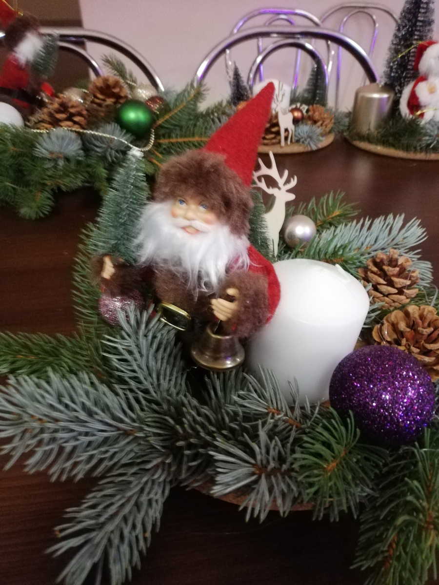 Podczas tego spotkania zorganizowaliśmy również warsztaty, podczas których uczestnicy mieli okazję wykonać zielone, świąteczne stroiki, które udekorują ich domy w nadchodzącym okresie świątecznym. Wykorzystano do tego gałązki świerku, szyszki, świeczki, figurki oraz kolorowe bombki. Każdy stroik był różnej wielkości i stylistyki, dzięki czemu powstały niepowtarzalne i kreatywne kompozycje.